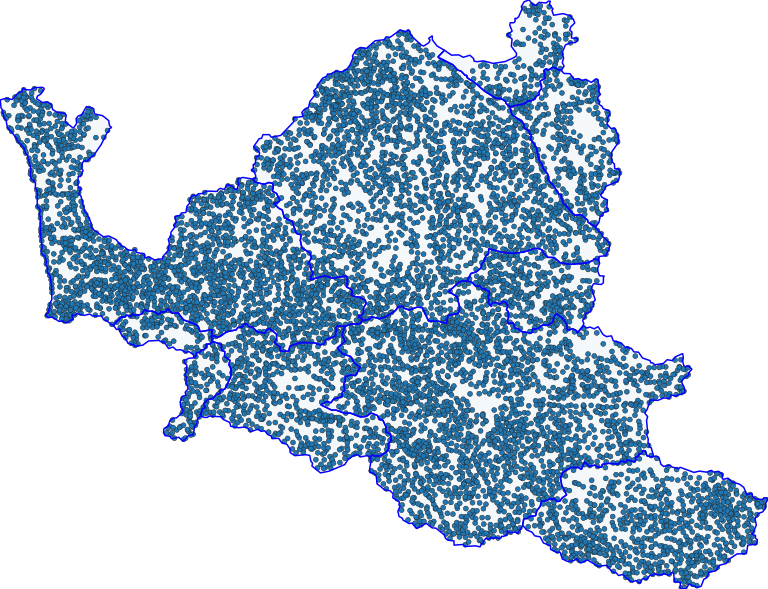 Nascentes extraídas a partir da hidrografia de Ouro Preto. Foi utilizado o plugin Stream Feature Extractor para obtenção automática das nascentes.