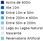 Camada que representa a base Hidrográfica de Minas Gerais classificando os rios em Classes (1 – 7) e também em categorias (Até 10 m – 10 a 50m – 50 a 200m – 200 a 600m – acima de 600 m – Reservatório Artificial)