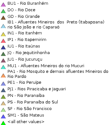São Francisco (SF), Grande (GD), Doce (DO), Jequitinhonha (JQ), Paranaíba (PN), Paraíba do Sul (PS), Pardo (PA), Mucuri (MU), São Mateus (SM), Piracicaba e Jaguari (PJ), Buranhém (BU), Itabapoana (IB), Itanhém (IN), Itapemirim (IP), Itaúnas (IU), Jucuruçu (JU) e Peruípe (PE).