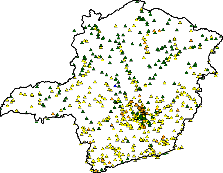 Foram atualizados os produtos, dados espaciais e sistemas em utilização e/ou vigentes, baseado na plataforma vetorial geoespacial representando a localização das estações de monitoramento de qualidade das águas superficiais em Minas Gerais. As colunas da tabela de atributos “IQA 2023”, “IQA 2022”, “IQA 2021”, e assim sucessivamente, representam a média dos resultados do Índice de Qualidade das Águas (IQA) observados na respectiva estação de monitoramento, no ano de avaliação.