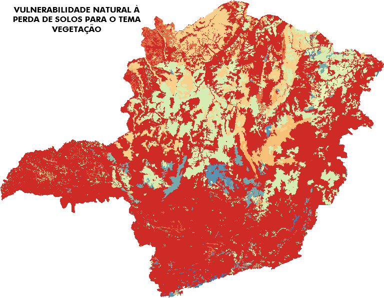 - Camadas matriciais com a representação da Vulnerabilidade natural à perda de solos em MG (resultado geral e pelos temas Geologia, Geomorfologia, Pedologia, Vegetação e Clima)