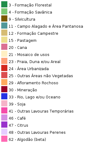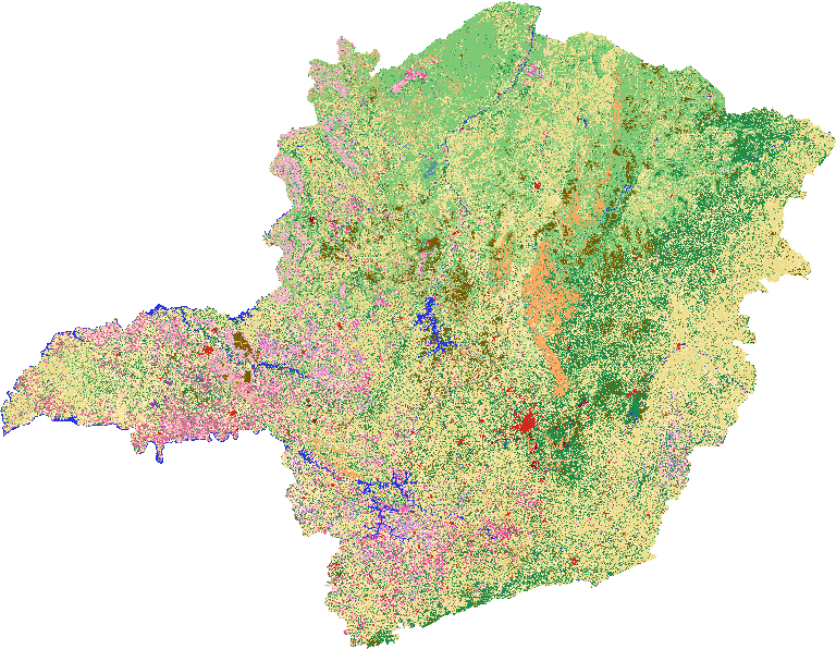 - Este produto é resultante de um mapeamento de cobertura e uso da terra, elaborados por meio da interpretação de imagens de satélite com o uso de metodologias de classificação do uso e manejo da superfície. Não deve ser confundido e/ou utilizado, portanto, para identificação de fitofisionomias florestais, que somente podem ser delimitados por meio de mapeamentos florestais, como o "Inventário da Flora Nativa e de Reflorestamentos", produzido pela Universidade Federal de Lavras (UFLA) e Sisema, entre 2003 e 2008.