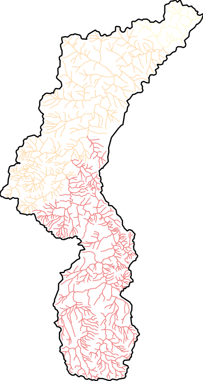 Determinação da pressão hídrica a montante e jusante dos trechos hidrográficos da sub-bacia do rio Preto, a partir da relação entre as captações de água da sub-bacia e a vazão Q7,10 por área de contribuição, como parte do Zoneamento Ambiental Produtivo (ZAP) elaborado pela Universidade Federal dos Vales do Jequitinhonha e Mucuri (UFVJM) em 2022.