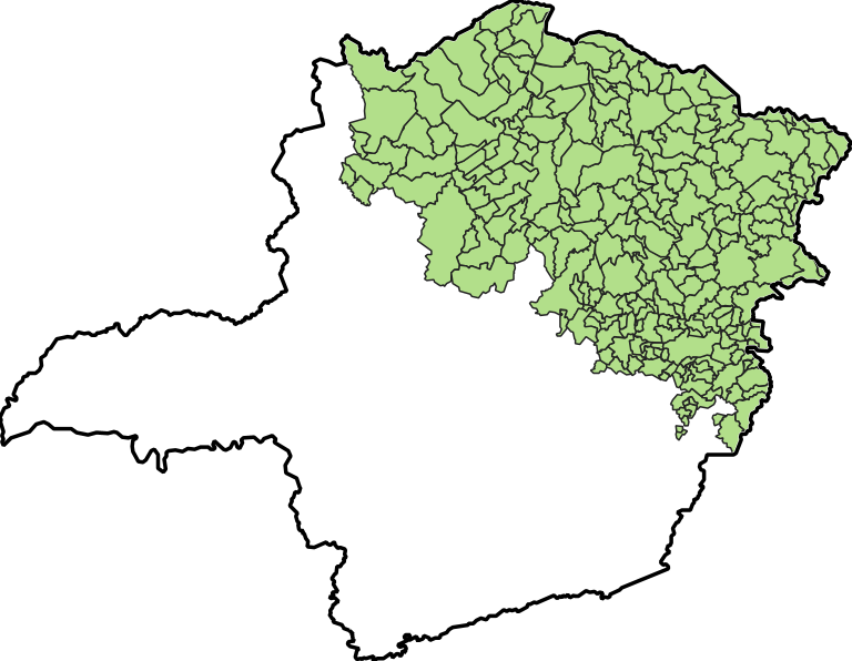 Camada vetorial com a representação dos municípios de Minas Gerais localizados dentro da área de atuação da Superintendência de Desenvolvimento do Nordeste (Sudene), conforme Lei Complementar nº 125/2007 e suas alterações