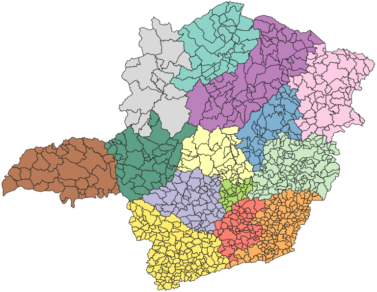Delimitação das regiões geográficas intermediárias do Estado de Minas Gerais. O produto integra a "Malha Municipal", que retrata a situação vigente da Divisão Político Administrativa (DPA), através da representação vetorial das linhas definidoras das divisas estaduais e limites municipais, utilizada na coleta dos Censos Demográficos e demais pesquisas do IBGE. A cada versão do produto, incorporam-se as alterações territoriais provenientes de: nova legislação, decisões judiciais (liminares e mandados) e alterações cartográficas (relatórios técnicos dos órgãos estaduais responsáveis pela divisão político administrativa que atualizam os memoriais descritivos legais a luz das novas geotecnologias). Os produtos descritos aqui apresentam as seguintes unidades territoriais: Municípios, Microrregiões, Mesorregiões, Áreas de Regiões Geográficas Imediatas, Regiões Geográficas Intermediárias e Unidades da Federação.